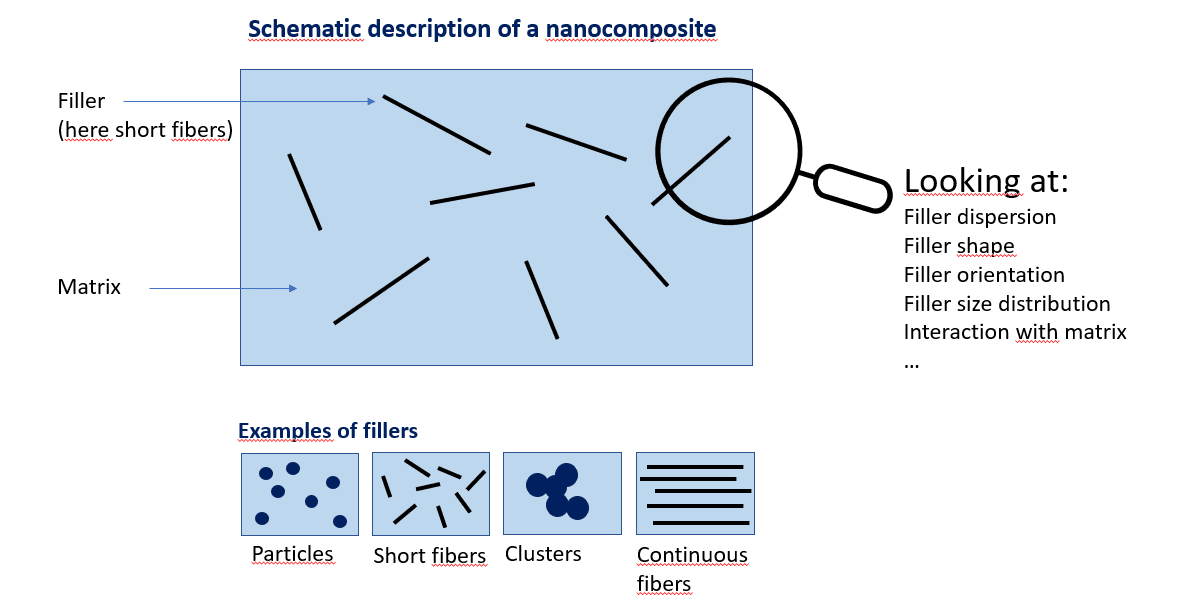 Nanocomposites are a type of composite material in which nanoscale particles or fibres (the filler) consisting of one or more materials are dispersed throughout a bulk (matrix) material. Both the filler(s) and the matrix retain elements of their own bulk material properties, while the nanoscale parameters of the fillers contribute novel properties to the nanocomposite. These parameters include dispersion, shape, orientation and size distribution of the filler particles, as well as their interaction with the bulk matrix.1-4