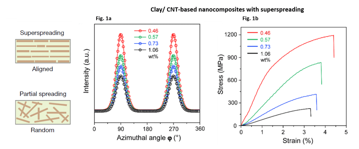 Figure 1 – X-ray scattering measurements and mechanical properties of Clay/CNT-based nanocomposite films produced by a new method of shear-flow-induced alignment of nanosheets (superspreading). Fig 1a: 1D plots of X-ray scattering intensity depending on azimuth angle for different concentrations of nanofillers (in wt%, see key)-orientation ordered parameter and nanosheets interlayer distance can be calculated (not shown). Fig 1b: corresponding stress-strain curves for the different nanocomposites. Adapted from Zhao, C., Zhang, P., Zhou, J. et al. Layered nanocomposites by shear-flow-induced alignment of nanosheets (Supplementary Data). Nature 580, 210–215 (2020).