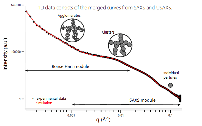 A standard SAXS setup allows measurement of the radius of gyration (an indicator of size) of the individual particles and aggregates of particles. With a Bonse-Hart Ultra-Small- Angle X-ray Scattering (USAXS) setup one can access larger length scales and obtain information about agglomerates, as shown in the curve below.