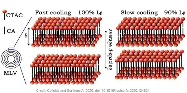 Even though the cooling rate has long been known to play an important factor in the production of gels based on long-chain alcohols and surfactants, the physical-chemical cause for these differences remained elusive. Cetearyl alcohol and cetyltrimethylammonium chloride (CTAC) form the basis of many pharmaceutical and cosmetic formulations. In a recent study,1 researchers from the chemical department of the University of Bari (Italy) in collaboration with L’Oreal and Lund University (Sweden), shed a light on the link between the cooling process and the rheological properties of the resulting gel. Using a multi-technique approach, they found that the use of different cooling rates results in the formation of multilamellar vesicles with different repeat distances. The gels formed with different processes show significantly different elastic and viscous moduli.