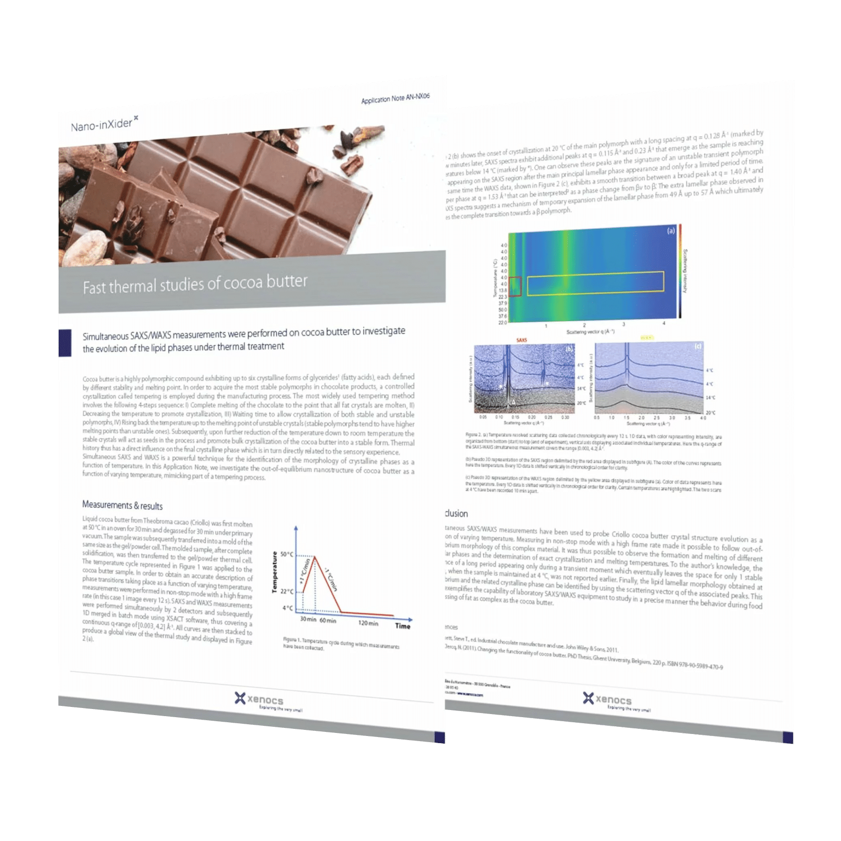 Simultaneous SAXS and WAXS is a powerful technique for the identification of the morphology of crystalline phases as a function of temperature. In this Application Note, we investigate the out-of-equilibrium nanostructure of cocoa butter as a function of varying temperature, mimicking part of a tempering process.