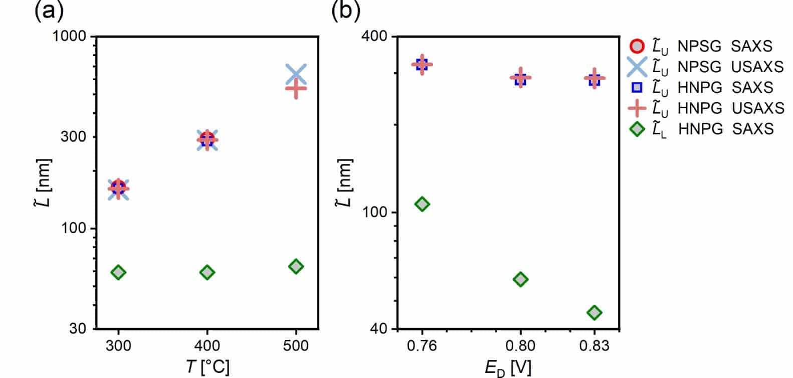 Fitting both SAXS and USAXS scattering curves with a combination of Gaussians and baseline functions allowed for quantitative analysis of the ligament spacings of both hierarchical levels. As evident from Figure 3 (a), the upper-level ligament spacing can be tuned in the range from 160 to 600 nm by increasing the annealing temperature from 300 to 500°C. At the same time, the lower-level structure will remain unaffected exhibiting a constant ligament spacing of 61 ± 3 nm. By contrast, modifying the dealloying potential during the second dealloying step while maintaining a constant TA will have essentially no impact on the upper-level structure (nm). Increasing ED from 0.76 to 0.83 V will however induce a decrease in from 107 to 46 nm (see Figure 3 (b)).