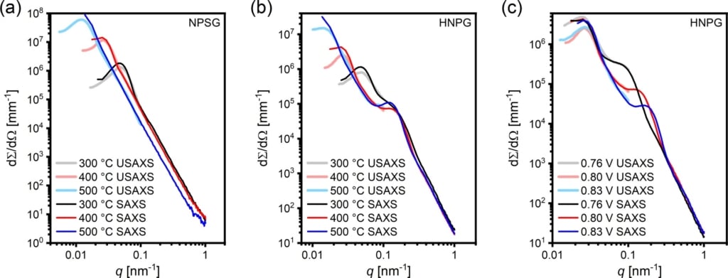 Fig. 2 Small and ultra-small angle X-ray scattering graphs of samples produced with different synthesis parameters: (a) Nanoporous silver-gold (NPSG) samples prepared with different TA; (b) hierarchical nanoporous gold (HNPG) samples prepared with different TA but identical ED = 0.80 V; (c) HNPG samples prepared with same TA = 400°C but different ED. Credit: Phys. Rev. Mater., 2023 DOI: 10.1103/PhysRevMaterials.7.116001.