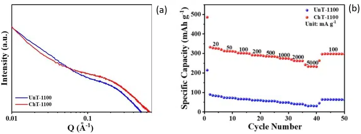 Fig. 4 (a) SAXS patterns of chemically treated (ChT-1100) and untreated (UnT-1100) rosewood samples. (b) Rate performance of discharge capacities at various current densities (indicated in the figure in units of mA/g) for chemically treated and untreated rosewood samples. Credit: SusMat, 2022, DOI: 10.1002/sus2.60.