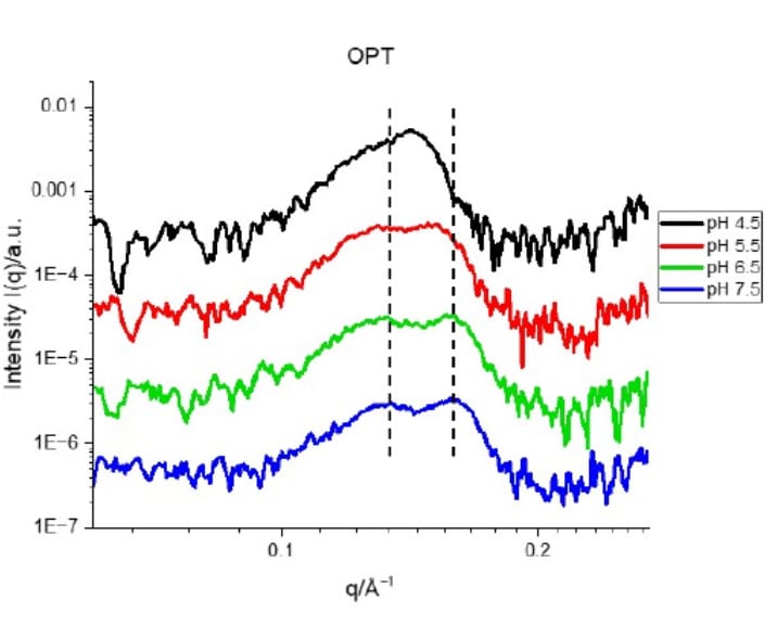Figure 3. SAXS profiles of the OPT mRNA-LNP formulation mixed with citrate- phosphate buffers at different pH values. Credit: Nanoscale, 2025 DOI: 10.1039/D5NR00433K
