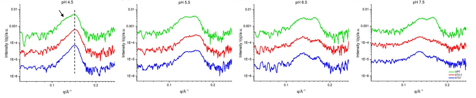At near-physiological pH (7.5), the optimized (OPT) formulation displayed strong signatures of both lamellar and hexagonal phases, while the reference formulations (Std1, Std2) showed weaker multilamellar features (Fig. 2).