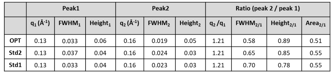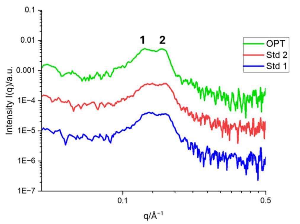 Table 1. SAXS peak features of the OPT, Std 2, and Std 1 formulations in 10% Trehalose.Credit: Nanoscale, 2025 DOI: 10.1039/D5NR00433K