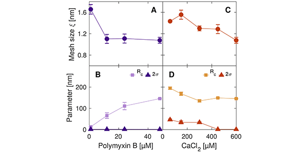 Figure 2. Structural parameters of the microgels, extracted from the SAXS data, as a function of the amount of peptide loaded (Polymyxin) and crosslinker (CaCl2) respectively.