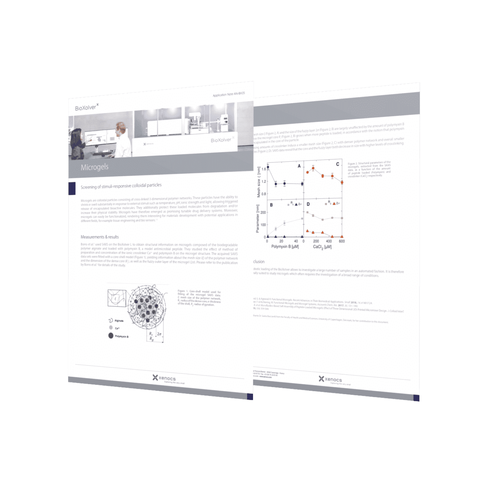 Borro et al.3 used SAXS on the BioXolver L to obtain structural information on microgels composed of the biodegradable polymer alginate and loaded with polymyxin B, a model antimicrobial peptide. They studied the effect of method of preparation and concentration of the ionic crosslinker Ca2+ and polymyxin B on the microgel structure. The acquired SAXS data sets were fitted with a core-shell model (Figure 1), yielding information about the mesh size (ξ) of the polymer network and the dimension of the dense core (Rc), as well as the fuzzy outer layer of the microgel (2σ). Please refer to the publication by Borro et al.3 for details of the study.