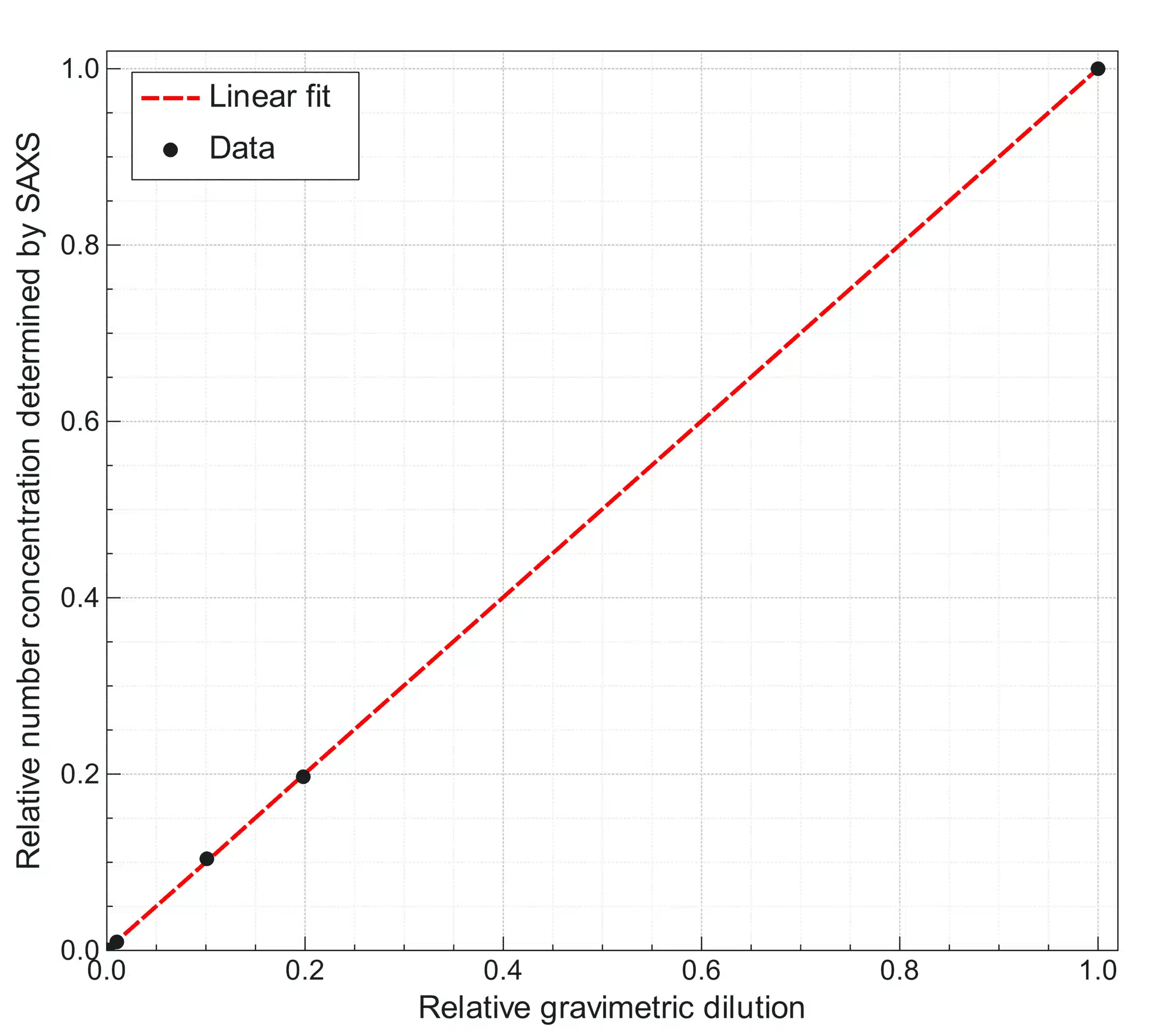 Figure: Colloidal dispersion of gold NPs with certified concentration measured as received and in dilution series. Relative number concentration determined from the SAXS profile as a function of the relative dilution determined gravimetrically when preparing the dilution.