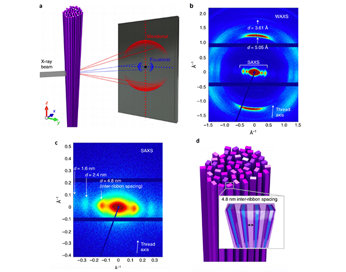 a) Orientation of a solid-state nanoribbon thread with meridional and equatorial scattering on the X-ray detector; b) 2D WAXS pattern; c) 2D SAXS pattern; d) Hypothesized structure showing the alignment of individual nanoribbons. Credit: images extracted from Nat. Nanotechnol. 2021, doi 10.1038/s41565-020-00840-w