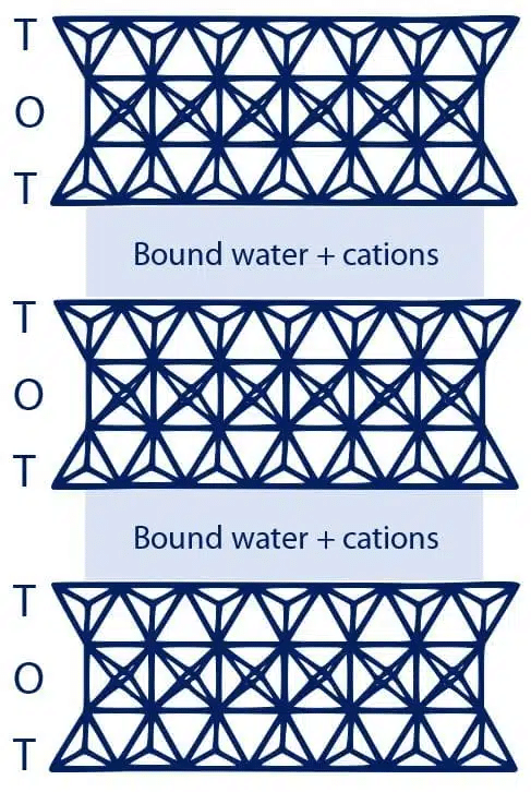 In the case of smectites, these sheets form a so-called T[etrahedra]-O[ctahedra]-T[etrahedra] structure. Between the T-O-T layers is the interlayer, containing various cations such as sodium, calcium or potassium (as depicted in Fig. 1). These cations are hydrated, loosely bound and easily exchangeable, and the ability of the smectite interlayers to hydrate gave them the title of “swelling clays”.