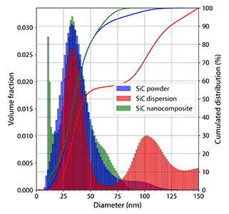 Figure 1. Particle size distributions obtained by SAXS on the SiC nanoparticles measured as a dry powder, as a dispersion or as a nanocomposite.