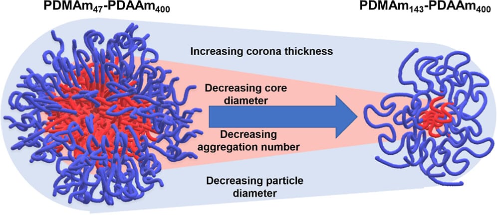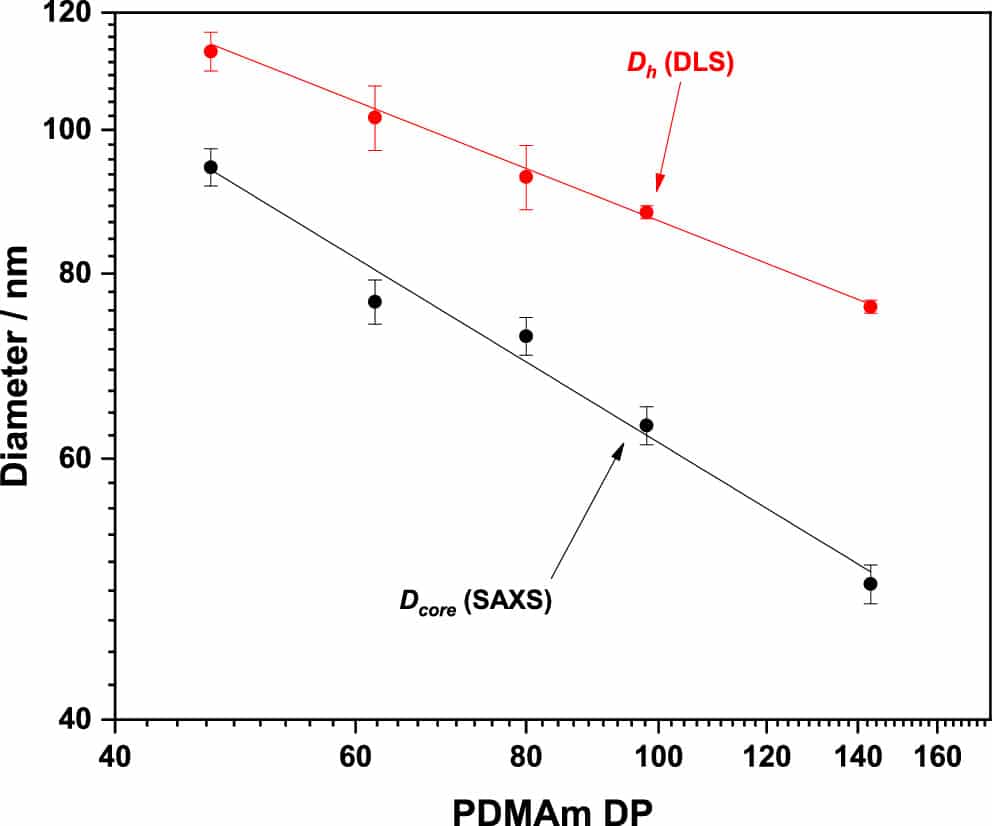 As shown in Figure 3, using a combination of SAXS and DLS analysis, researchers proved that despite the reduced overall diameter of the particles as a function of increasing DP of PDMAm, the contribution of the corona itself is increasing. This information would not have been attainable by employing only one of the two techniques.