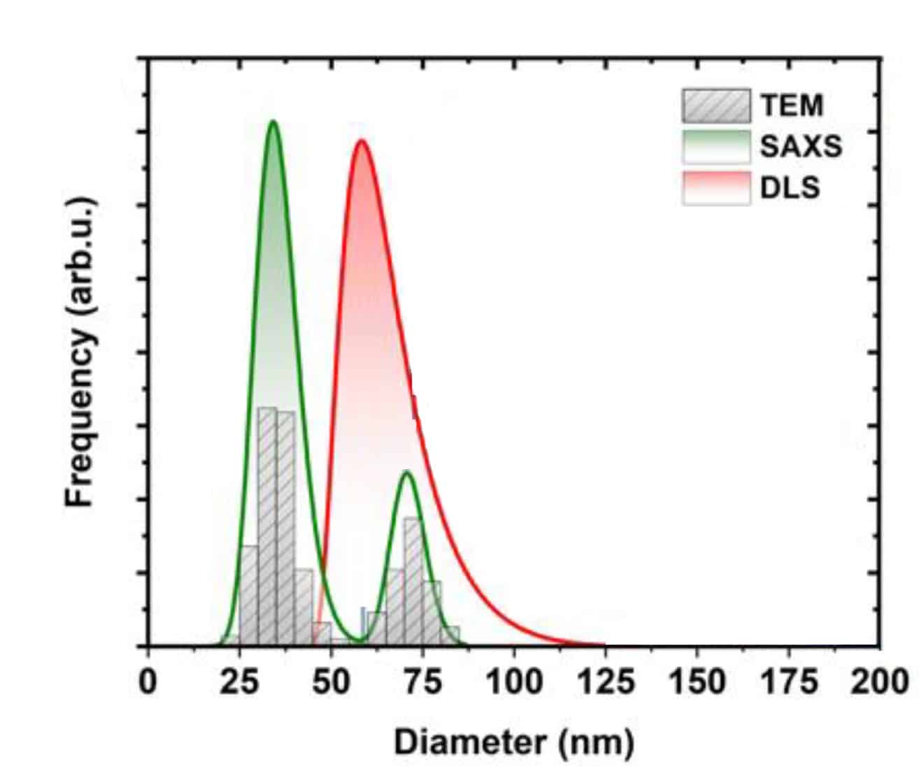 Both SAXS and DLS are indirect techniques that require a physical model to extract the nanoparticle size from the raw experimental signal. DLS relies on the principle of Rayleigh scattering, which states that the intensity of light scattered by a particle is directly proportional to the sixth power of its diameter [10]. Thus, large-diameter NPs scatter light orders of magnitudes more intensively than smaller ones making DLS a technique with limited capabilities of resolving bimodal and heterogeneous ensembles of particles. Moreover, DLS may not accurately represent particles with non-spherical or irregular shapes, as it simplifies their geometry to that of spherical non-interacting particles for analysis employing the Stokes-Einstein equation.